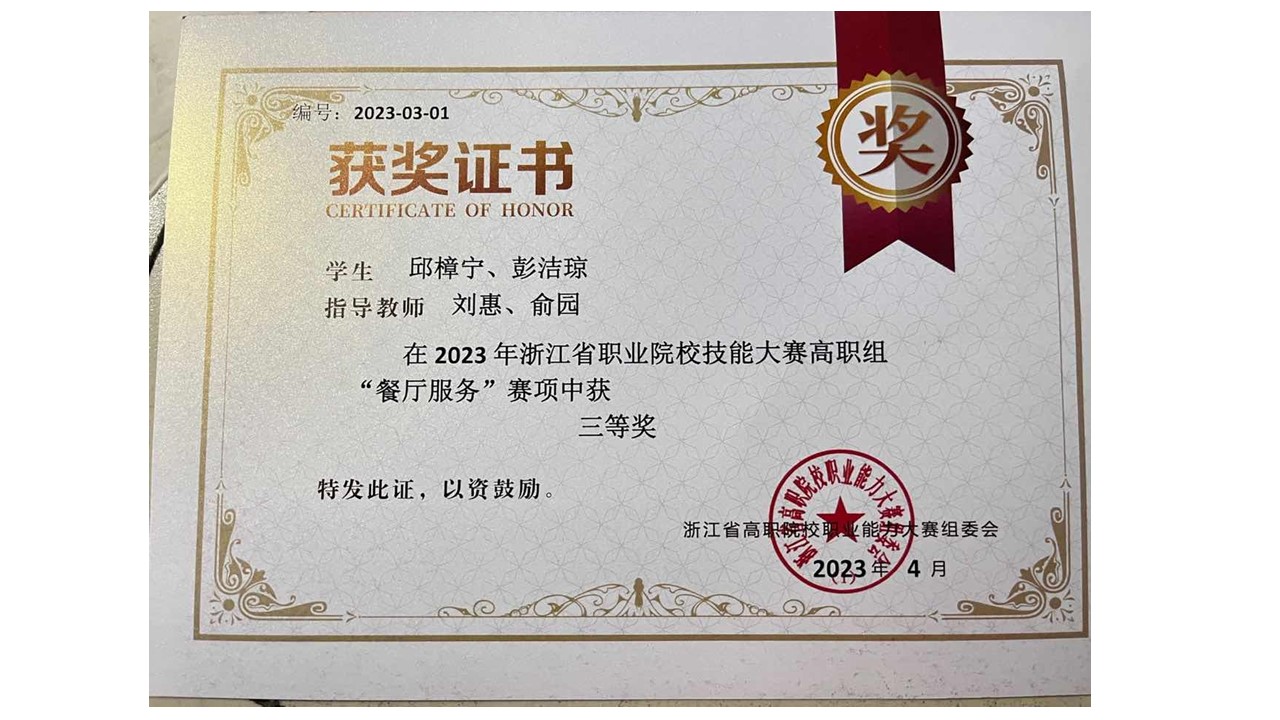 浙江省职业院校技能大赛(高职组)“餐厅服务”赛项团体三等奖——获奖学生:邱樟宁、彭洁琼 指导老师:刘惠、俞圆